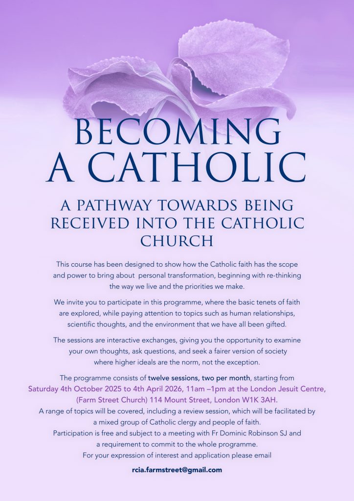 RCIA is aimed at anyone who has been considering becoming a Catholic. The programme based at Farm Street, Mayfair is conducted by experienced lay parishioners and Priests and Nuns. There are twelve sessions held twice a month beginning on 21st October and finishing on 23rd March.